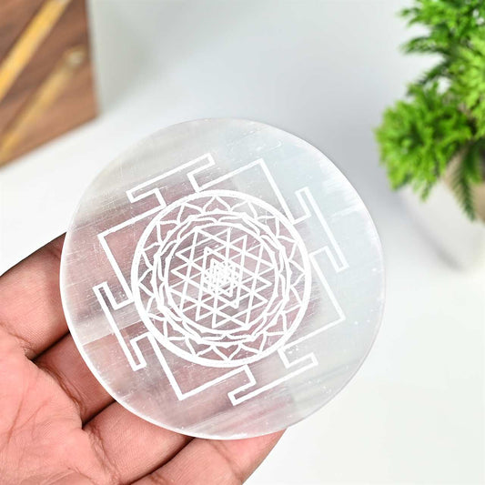 Shree Yantra on Selenite Plate – Natural Crystal for Wealth, Peace & Energy Cleansing