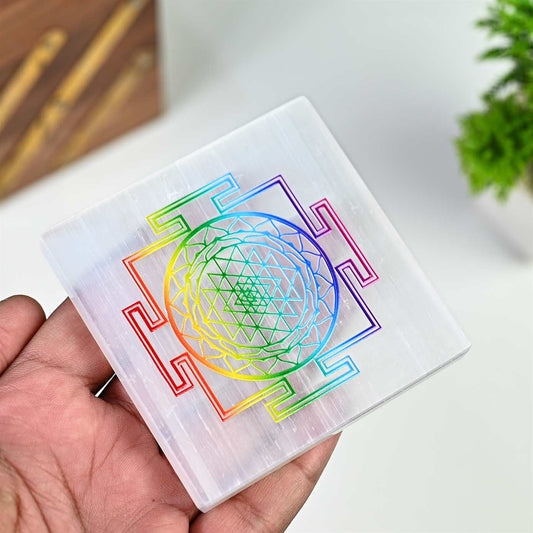 Seven Chakra Shree Yantra on Selenite Plate – Spiritual Decor for Wealth & Energy Balance