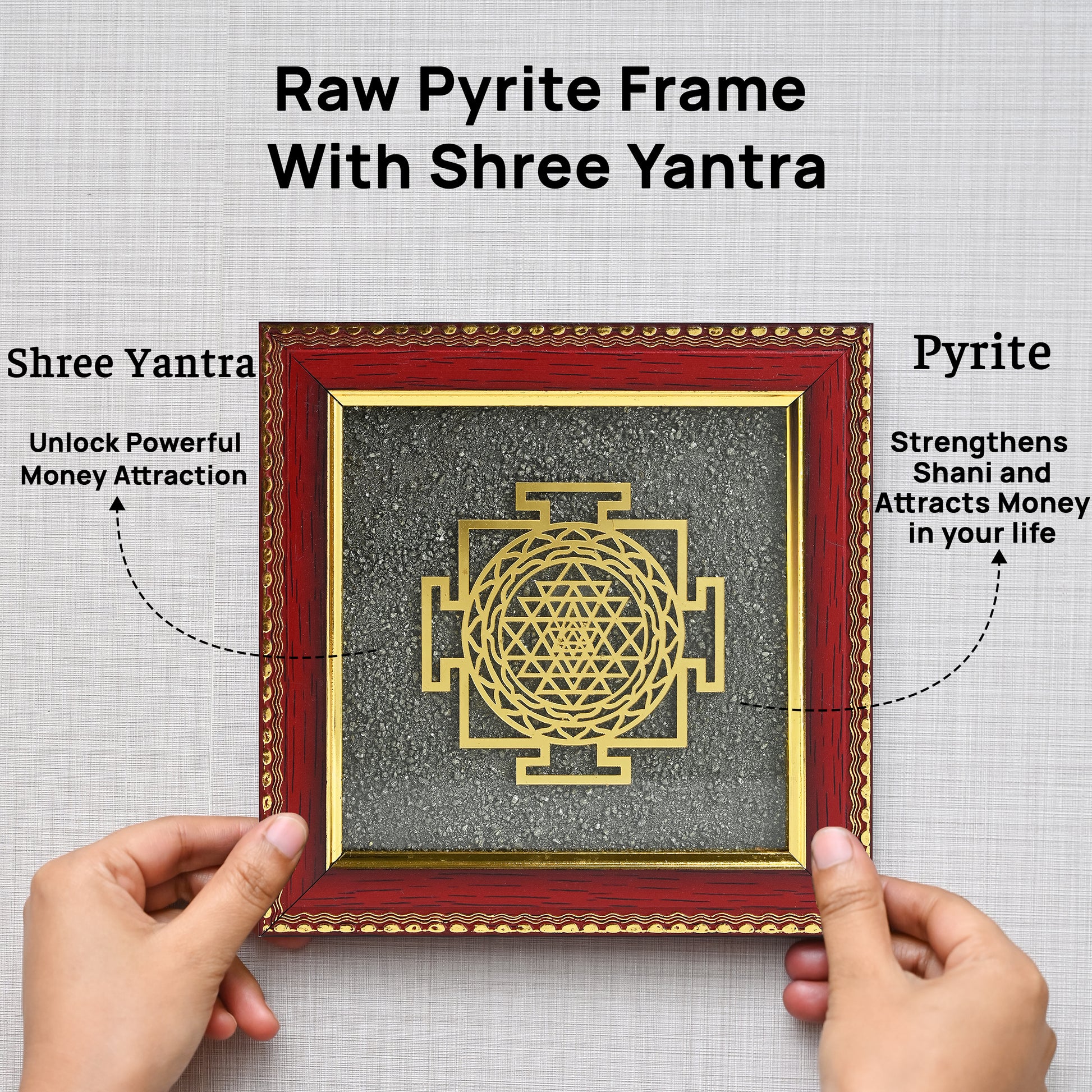 The Sri Yantra Pyrite Dust Frame is a powerful combination of sacred geometry and the energy of pyrite. The sparkling Pyrite Dust, also called Fool’s Gold, has long been cherished for its ability to attract money, abundance, success, and protection from negativity. When combined with the Sri Yantra, one of the most auspicious symbols in Vedic tradition, this frame becomes a source of spiritual growth, clarity, and positive vibrations.